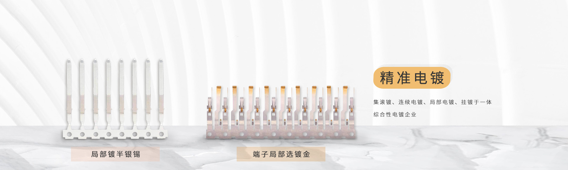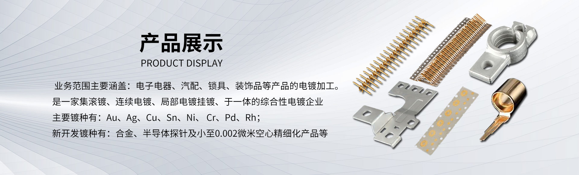 營(yíng)業(yè)性質(zhì):電腦、手機(jī)、汽車(chē)、數(shù)碼相機(jī)等電子電器及五金端子電鍍.電鍍種類(lèi)包含鍍銅、鍍金、鍍亮錫、鍍亞錫、鍍銀 掛鍍鎳、掛鍍銅排、鍍鉻、珍珠鉻及其他選擇性局部電鍍.